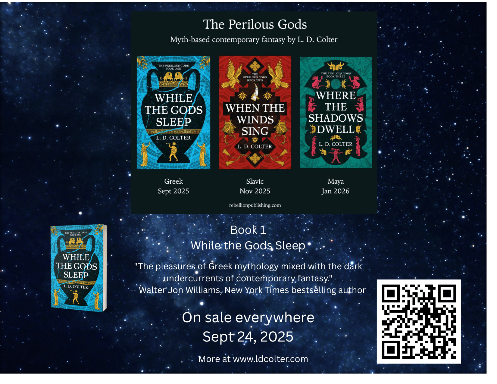 More Slavic mythology books(Reka's Grasp is the only book here I haven't read yet, but I recently met the author and put it on my list.) Book One Is Out NOW - here's my most recent interview about While the Gods Sleep, the series, and how the publishing deal came about:https://jamreads.com/interviews/some-thoughts-with--l-d-colter And the interviewer's review of While the Gods Sleep. Don't want to go to the link, here's his final summary: While The Gods Sleep is a great dark fantasy novel, a perfect read if you like fast-paced and high stakes fantasy while being a lover of mythology; a first installment (standalone) of a series that promises to continue exploring other mythologies, something I'm totally in for! https://jamreads.com/reviews/while-the-gods-sleep-the-perilous-gods-1-by-l-d-colter BTW -- in case you're wondering... Cute Animal VideoIn honor of Jane Goodall who passed away Oct 1st while on a speaking tour, here's a famous clip of a chimpanzee hugging her before returning to the wild: Closing Out, Here's a Special Chapter One Preview for Newsletter Subscribers: When the Winds SingL. D. Colter©2025Chapter One A sharp and tangy scent of ozone seeped under Alex’s motorcycle helmet, a single breath of warning before the heavy drizzle ripened to a cold, drenching deluge. Gray streaked the air. The landscape muted around him, blurring into a background of clouds and mist as rain bled down over the coastal redwoods and red barns and faded green pastures along the rural road. He reduced his speed to adjust for the slick asphalt and gusty winds. Winter rain was a familiar companion in this northwestern corner of California, but he’d always viewed weather as an integral part of a whole rather than an annoyance to rail against. Even his parents passing away on wet winter days hadn’t bound his grief from those times to gray skies and chilly rainfall. Nature, in all its forms, brought him a measure of peace that little else in his life had ever equaled. Negotiating a curve in the road, a bearded, grandfatherly figure came into sight in the field on his left. The man was standing maybe a hundred feet from the road, flying a kite. The cheap drugstore model with its paper skin, light wooden skeleton, and tail of rag cloth shouldn’t have been able to fly in this weather any more than if he’d tied a wet wool sweater to his string. Yet, it not only stayed aloft in the storm but sailed strongly, fifty feet or more above the road. The entire scene defied both logic and physics. Alex searched for a rational explanation for the man, the activity, or the aerodynamics of the kite and came up blank. Raindrops as large as teardrops splashed his visor and dotted his vision as he lifted his head to follow the kite’s implausible acrobatics. A solitary car passed, traveling in the opposite direction. With no other traffic in sight, he eased off the throttle for a better look. The garbage bag rain jacket over his secondhand leathers flapped with decreasing violence as he decelerated. The cold had penetrated his layers and his fingers felt numb inside his gloves, so the old guy must have been freezing. The gray wool suit hung dripping from his torso, and the woolly black hat perched on his head offered no protection for his face or neck. Alex saw no structures in the field and no car parked along the road. He couldn’t guess where he’d come from as none of the widely scattered farmhouses nearby were within comfortable walking distance for the weather. The man held the spindle of twine with both hands, locked in battle with the kite that strained to break free and soar east. Alex drew level and saw a flash of white teeth and the man’s shoulders shaking with laughter while the kite bucked high above the road, directly overhead. Lightning streaked the sky, rare and unexpected at the coast. It filled Alex’s vision. The white kite vanished against the bright flash, as if morphing into pure energy. And where the old guy held one string, the afterglow of the flash and the moisture on Alex’s visor created the image of hundreds of strings, thousands, shimmering between the man’s hands and the sky. Thunder boomed, loud as a bomb detonating. He lifted one gloved hand to wipe his visor just as a brutal blast of wind hammered into his side, unbalancing him. Grabbing at his bike’s handlebar again, he overcorrected, swerving left then right. The gust reversed direction, like some ocean monster inhaling to hurl another blast. Above him, the kite plummeted on a sudden wind shear and the vertical wooden strut shot toward him like a crossbow bolt. He braked and veered to evade it. His back wheel lost traction on the wet road. The motorcycle toppled to the right as the kite hurtled toward him. A second before the strut would have speared him, the kite jerked horizontal, scooping the air and flying parallel to the ground. The sound of vibrating paper momentarily eclipsed the noise of his motorcycle peg scraping the pavement as the kite arrowed toward the old man, who must have yanked the line. Alex tried to kick free of the bike, but it skidded out from under him before he had a chance. He slid less than a yard, tearing the garbage bag from his shoulders and scuffing his pride worse than his jacket. Lying in a puddle, half on his right side, his brain took a moment to assess the impact. Drizzle pattered on his helmet—the heavy rain having stopped as suddenly as it had started—while he confirmed he’d sustained nothing worse than a bruised hip and shoulder. Shaky and amped on adrenaline, he pushed to his feet and cursed himself for an idiot for falling over at low speed in the middle of an empty road. He felt more like a high school kid who’d tripped on the stairs than a thirty-two-year-old ex-con who’d dumped his motorcycle. Flipping his visor up, he glanced reflexively at the field to see if the old man had witnessed his fall. He hadn’t. He was preoccupied with a younger man who stood face-to